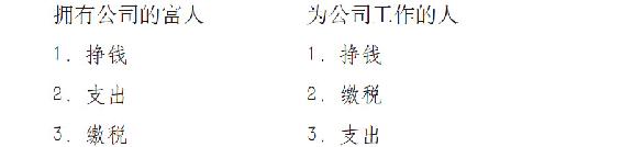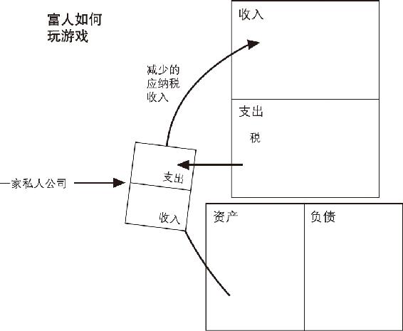 雇员挣钱、纳税,并靠剩下的钱为生;企业挣钱、花钱,并只为剩下来的钱缴税。这是富人钻的最大的法律的空子。如果你有能带来现金流入的投资,你就可以轻松、廉价地使用这些漏洞。例如,假如你拥有自己的公司,在夏威夷召开的董事会就是你的假期,买车以及随之而来的车险和修理费也可以算是企业的支出,健身俱乐部的会员费是企业支出,大部分的餐饮费也算是企业的支出,如此等等,但要注意在税前合法支付它们。
