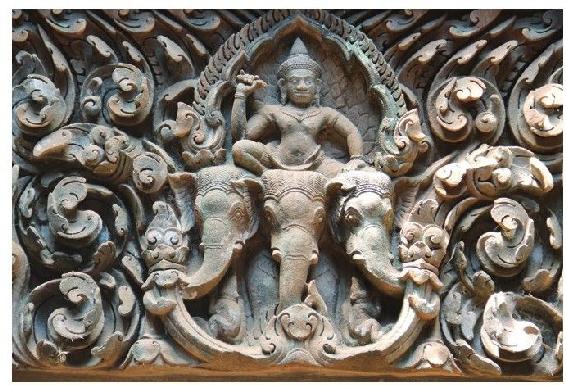 瓦普寺上的雕塑。与柬埔寨、泰国的吴哥雕塑如出一辙。