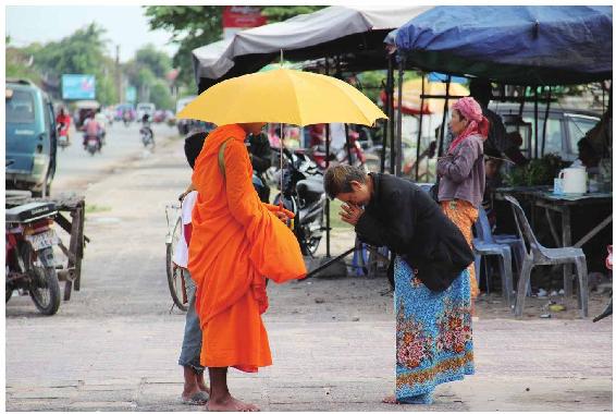 第二天清晨,从昂戈博雷回到茶胶,一群清晨出门化缘的僧人吸引了我的目光。由于佛教国家僧人地位较高,他们的化缘仿佛是赠予,而非祈求施舍。每一个化缘的僧人都穿着橘黄色的僧袍,打着一把黄伞,怀里抱一个化缘钵,如果两个人同行,则一个人持钵,另一个人提化缘袋。当他们走到商户的门口,并不登门,而是静静地伫立在门前等待着。商户里的人会出来,谦恭地把钱放进化缘袋,或者把食品放进钵里,再虔诚地低下头,双手合十,请求着僧人的祝福。僧人们嘴中念念有词,背诵着经文,为施舍的人们祈祷着。