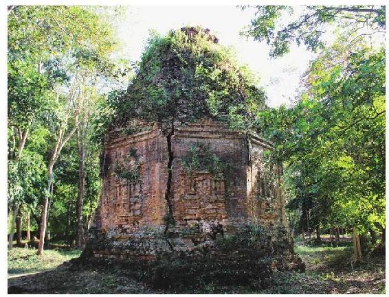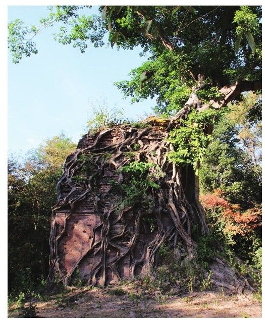 三波坡雷古的建筑大多位于道路的南侧,但是,在道路的北侧却有一座更加令人瞠目的塔。一座榕树的根已经将塔身完全包裹了起来,网状的树根如同一顶奇特的帽子罩在塔上,告诉人们什么是岁月的痕迹。