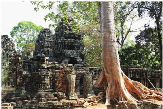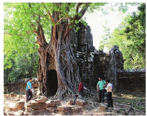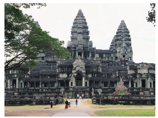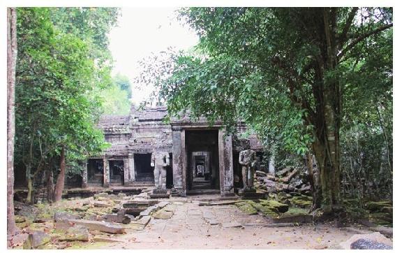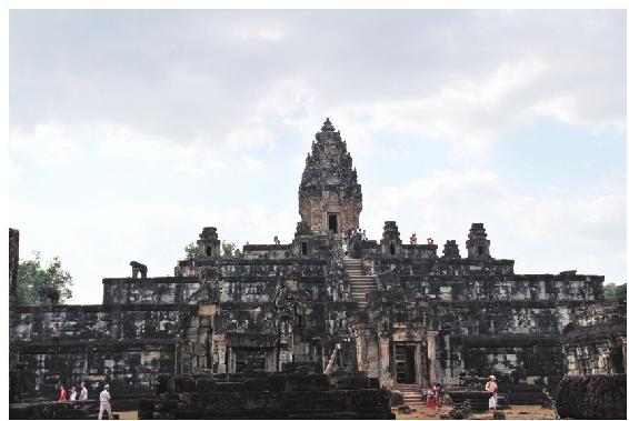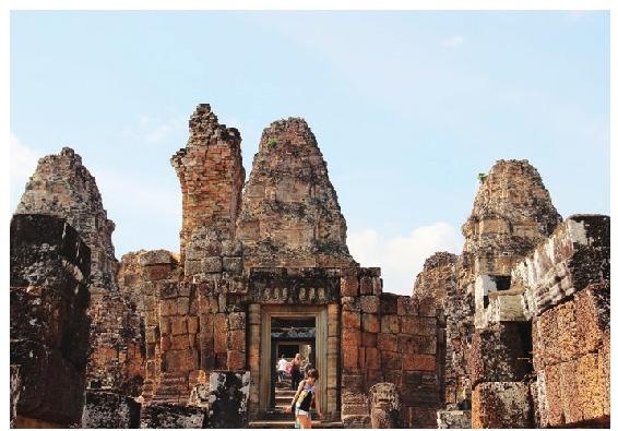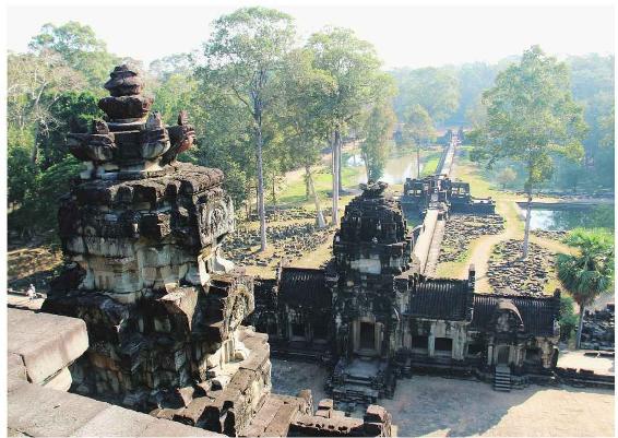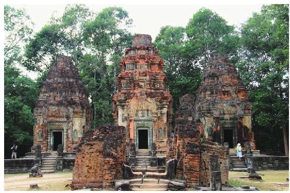 罗洛寺群的巴空寺。巴空寺已经是高大的石头建筑,并拥有着高大的塔山和复杂的护城河系统,成了吴哥大型寺庙的先驱。