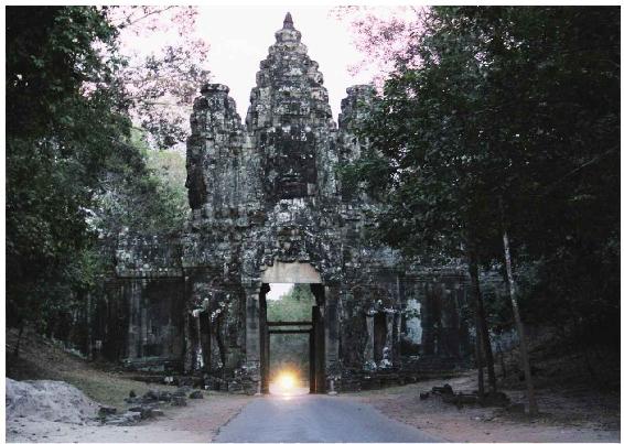 胜利门夜景。夜间的吴哥如同恢复到了未被发现之时,除了虫子的叫声,很少听到其他的动静。