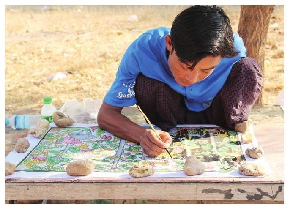 缅甸的沙画艺人。由于涂了漆,缅甸的沙画不怕水浸,甚至可以经受水洗