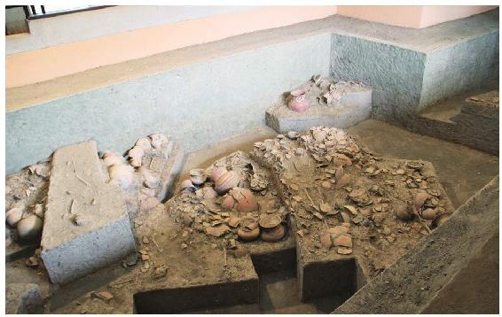 婆西奈寺考古现场博物馆,发掘现场出土的密集陶器和骨骸。
