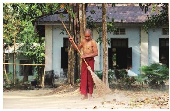 更令我惊讶的是,在当地最大的寺庙旁边还有几座废墟,这些废墟有的已经没有了屋顶,只有墙还站立着;有的经过当地居民的翻修,现在还住着人。在一个废墟上,一棵顽强的小树攀在了废墟顶端的砖墙上,它的根完全裸露在外,像章鱼一样挂在墙上,却仍然不屈地活着。这些房子的建筑风格既不属于佛教,也不是穆斯林的,它们有着美丽的天使雕像和镂空花纹,很显然来自于那个被遗忘的殖民地年代。