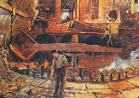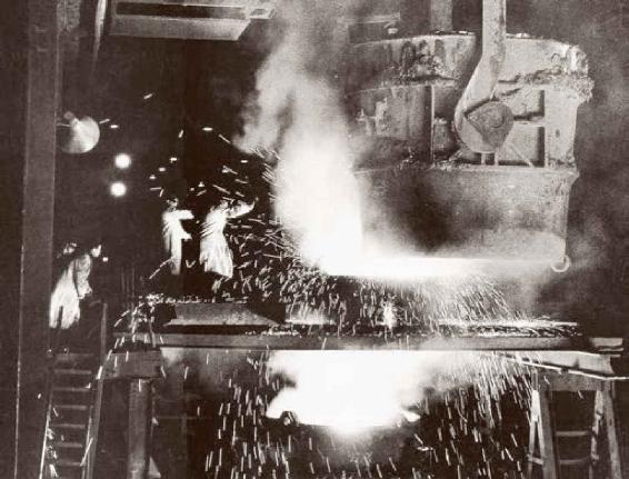 通过劳动变革过程中技术条件和社会条件的改善,提高劳动生产力,缩短商品的社会必要劳动时间,以较小的劳动量获得较大的使用价值。英国发明家亨利·倍斯麦吹氧法是用一股氧气烧去熔铁中多余的碳从而制造出高强度的钢,其应用使人类迈进了钢铁的时代。图为1948年在伯利恒一家钢铁厂里,所熔铸的一块2200吨重的磁铁,其吸力能使原子以每秒16万英里的速度移动。