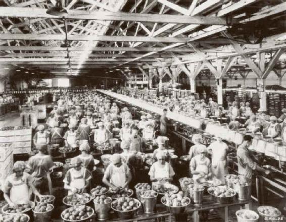 资本主义劳动规模的扩大,促使工人协作劳动,协作不但有助于减少生产成本,而且产生一种比单个劳动力的总和强大得多的集体力,有效地促进了资本主义经济的发展。图为20世纪30年代美国一家罐头工厂内工人们清洗削切西红柿,然后罐装保存的工作场景。