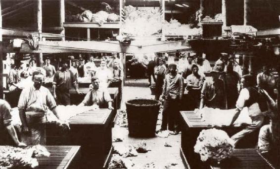 在机器还不起重大作用的生产部门,简单协作始终占统治的形式。甚至,在工场手工业或机器大工业时期,简单协作仍然可以同比它更先进的形式一起并存。图为澳大利亚新南威尔士州的羊毛分类工人在工棚里的场景。工人将根据羊毛质量分成各种等级,然后,捆扎包装,运往纺织厂。