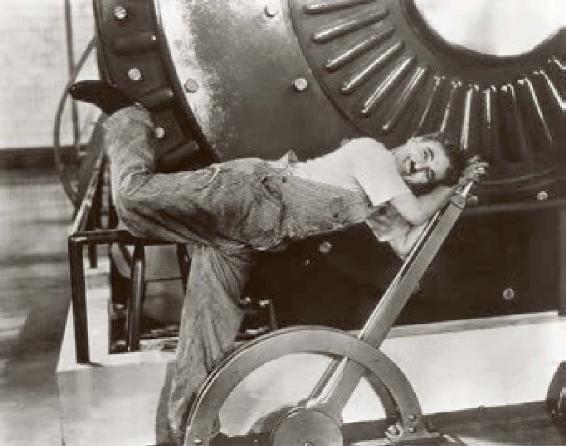 为了在一定期限内完成大量的商品,资本家把制造一件产品的各种操作分配给不同的手工业者,共同完成一种产品。在生产过程中,随着分工越来越细,这种局部操作逐渐成了特殊工人的专门职能,最终把人变成生产机构的一个器官。图为卓别林在影片《摩登时代》中,用滑稽夸张的肢体语言,讽刺并揭示工人被资本家榨尽最后血汗的残酷现实。