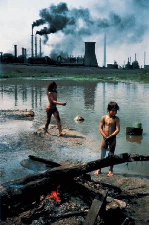 大机器生产把人类带进了一个发达的工业社会,工业和交通工具对自然界的危害很快就暴露出来。工业废物和未经处理的污水污染了河流和沟渠,破坏了生态环境。图为东欧一个污染严重的城市,空气和河流中布满黑黑的烟尘,河边两个吉卜赛小孩也被染成了黑色。