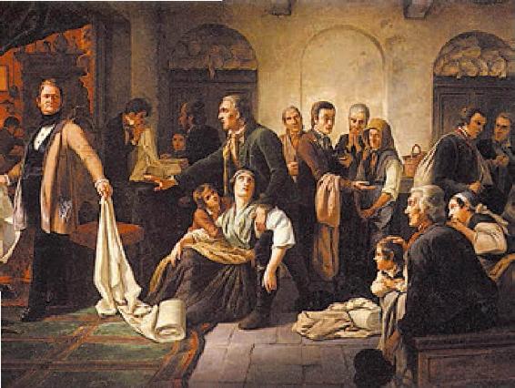 工人的劳动分为必要劳动和剩余劳动两部分。资本家要达到价值增殖的目的,一方面是延长工作日;另一方面是改进设备、技术,缩短必要劳动时间。在资本主义前期,以第一种方式为主;后期以第二种为主。图为里昂的丝绸工人向资本家缴纳产品时的情景。资本家目光苛刻,态度蛮横;可怜的工人脸上充满了无奈与悲哀。