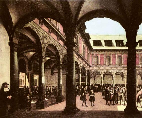 世界上最早的股份有限公司制度诞生于1602年,即在荷兰成立的东印度公司。股份有限公司这种企业组织形态出现以后,很快成为资本主义国家企业组织的重要形式之一。伴随着股份公司的诞生和发展,带动了股票市场的出现和形成。早在1611年就曾有一些商人在荷兰的阿姆斯特丹进行荷兰东印度公司的股票买卖交易,形成了世界上第一个股票交易所。图中是17世纪时阿姆斯特丹股票交易大厅的繁荣场面。
