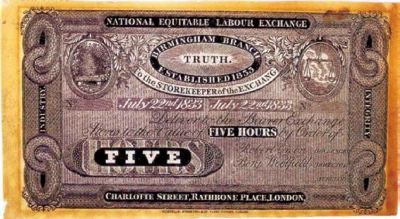 乌托邦理想主义者罗伯特·欧文在1832年在伯明翰推出了这样一种“劳动兑换券”,他认为只有劳动才能衡量价值的多少,商品买卖价格应由制造该产品具体花费的时间来定。本券就显示持有者可以买到价值5个劳动时的东西。但此举不久就宣告失败。