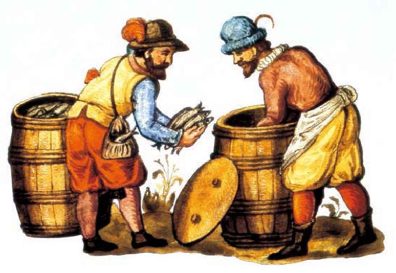 商品本身寿命的长短,决定了它作为商品流通时间的长短。对商品进行保鲜加工,会扩大商品空间流通领域,从而导致生产的增加。图中的商人正是为了延长青鱼的售卖时间,将青鱼放在木桶里腌渍,这样不但可以延长售卖时间,还可以远销外地。
