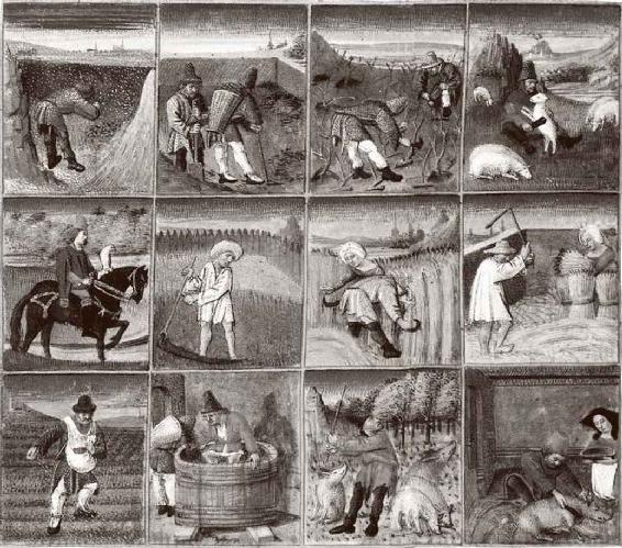 为了缩短资金周转时间,减少生产过程的间断,农民采取进行多种作物的生产。但在加长劳动时间的同时必须控制固定资本的增加,这样才能加速资本的周转。图中是一份15世纪的历书,形象地描绘出一年之中的12个月中的每种劳作。一月下雪,二月翻土,三月修剪葡萄枝,四月羔羊出生,五月打猎,六月割牧草,七月收获庄稼,八月打麦,九月播种,十月榨葡萄汁酿酒,十一月放猪到橡树林中吃橡栗,十二月杀猪。