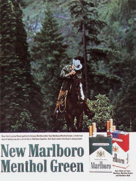 1607年—1776年是美国殖民地时期,在此期间,农业因为有充足的土地资源而使殖民地的人们能够在广阔天地里大有作为。南方殖民地的烟草生产由“肮脏的野草”变成了“金色的叶子”,它和稻米、靛蓝等经济作物一样为殖民地的农业带来了勃勃生机。直至19世纪,南方农业在创造产值方面仍居主导地位。现今美国农业人口的比例已从最初17世纪的约90%下降到今天的2%。但农业生产率很高,生产的粮食占世界总产量的14.6%。图中是20世纪60年代美国的“万宝路”香烟广告。