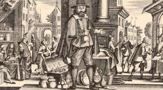 生产消费资料过程中,生产工人必要生活资料的资本家,在支付工人工资后,又把这些必要生活资料卖给自己的工人,资本家的预付资本,就通过工人用工资购买这些必要生活资料而直接流回资本家手中。图中17世纪的德国商人售卖的正在人们必需的日常用品。