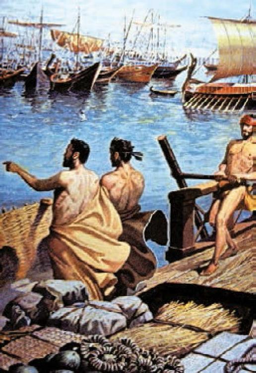生产资料和消费资料交换中,行使消费职能的资本家把不变资本,从消费资料形式再转化为消费资料的生产资料形式,使消耗的不变资本得到补偿,并重新执行资本的职能;同时,生产资料中的劳动力的等价物和资本家的剩余价值,则由生产资料的实物形式化为生活资料的实物形式进入个人消费。图中雅典商人只有贩出他们的货物才能赚取货币满足个人生活需求。