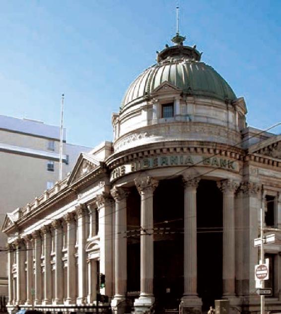 银行业最早诞生于欧洲。1272年,意大利富有的家族为了经商方便设立了一名为“巴尔迪银行”的机构,银行一词,源于意大利文Banca,原意是商业交易所用的桌椅。稍后又出现了“佩鲁齐银行”、“麦迪西银行”和“热那亚圣乔治银行”,但它们都不是现代银行,直至1587年建立的“威尼斯银行”才被认为是第一家具有现代意义的银行。图中是美国旧金山的希伯尼亚银行。