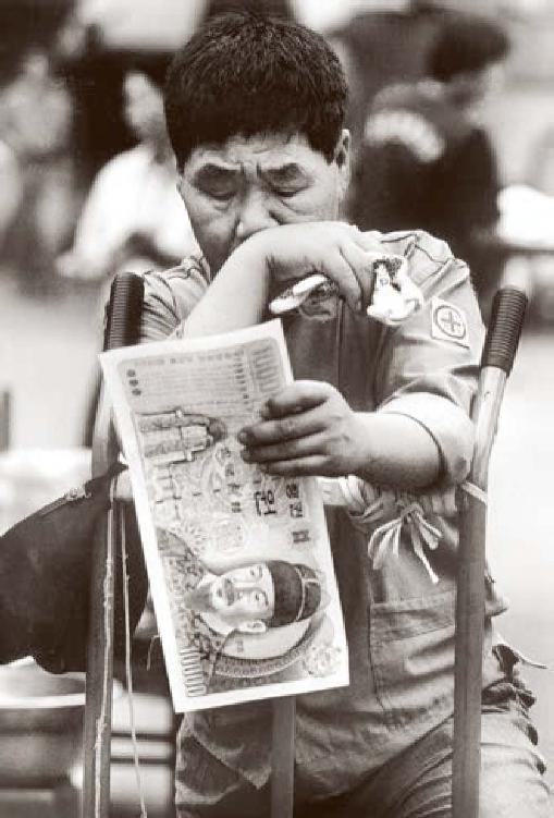 第二次世界大战后,欧洲对通货膨胀视如洪水猛兽,至今仍未放松警惕。通货膨胀最初是指纸币的发行量超过了商品流通所需要的数量而引起贬值,物价随之上涨的现象。在宏观经济学中,通货膨胀主要是指价格和工资的普遍上涨。图中的韩国工人对着因遭金融风暴冲击而大幅贬值的钞票一筹莫展。
