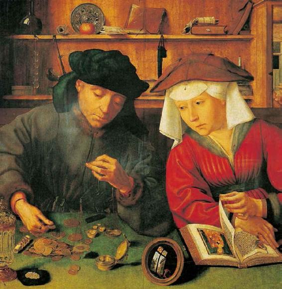 在进行实际资本积累和扩大再生产以前,剩余价值转化为货币以及货币的贮藏都需要一个相当长的时间。只有在作为资本积累的货币额达到一定数量后,才能进行扩大再生产。图中是16世纪上半叶一位商人与他的妻子慢条斯理地盘点着钱币,俨然一幅精打细算的样子。