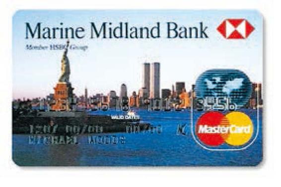 商品流通中,货币充当支付手段会产生并扩大信用事业。信用卡最早于20世纪50年代出现在美国,这种信息快捷交流、资金的极速流动,对世界的经济产生着深远的影响。图中为纽约米特兰银行发行的信用卡。它选取了世界著名的金融街曼哈顿街及远处的自由女神像作为信用卡的图案。