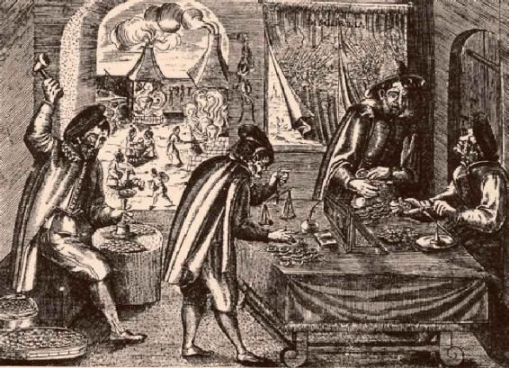 积累的货币是由进行实际积累的资本家提供的。但是,货币贮藏不是生产,早在资本主义商品生产以前的简单商品流通中就已经产生了货币贮藏。因此,社会拥有的货币量,总是大于实际流通中的货币量。图中是17世纪德国人制造钱币的场景。
