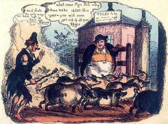在乡村因为运输不便利,市场范围狭小,贸易发展受到制约。与城市里的批发商相比,虽然他们单个商品所赚取的差额会比批发商多,但大的批发商因商品充沛,流通顺畅,总是能很快地收回资金,贸易也可以随着资本的积累而扩大。图中是一名农场主正在敦促它的雇工将猪快些运往市场。