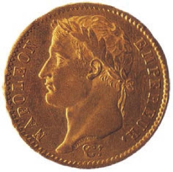 贵金属钱币是以自身的重量为价值,现代金属钱币则把其价值印在面上。图为一枚“拿破仑”金币,是自1804年以来面额最大的金币,面值为20法郎。法郎首次发行于1795年,在10年大革命的混乱时期,国家不断发行纸币,导致了通货膨胀。是拿破仑及时实施了财政改革,并坚持强硬的政府干预,才使法国的通货系统重新步入正轨。