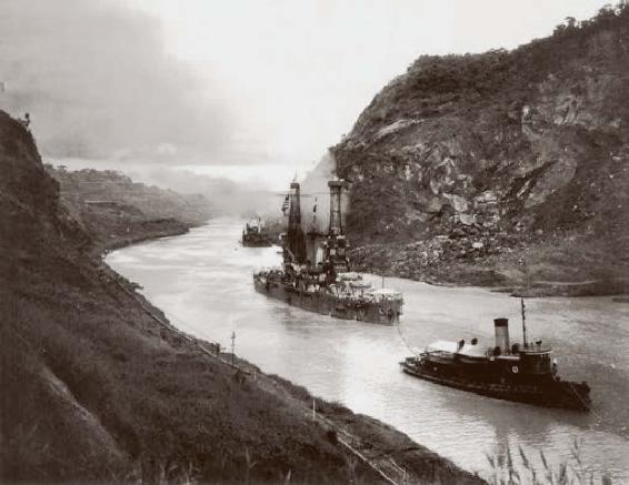 在人类社会发展的较高阶段,利用自然资源,控制驯服自然力使河流、森林、矿藏更好地服务人类,显得尤为重要,甚至可以说这种必要性在产业史上起着最有决定性的作用。1914年,一条横贯巴拿马的峡谷运河将太平洋和大西洋连在了一起。在运河施工的高峰时期,劳动力总人数达8.5万人,医疗知识、科学技术和铁一般的组织纪律,以及3.52亿美元的预算保证了运河的开凿成功。图中是1915年美国战舰俄亥俄号驶过巴拿马运河的卡雷布拉通道。