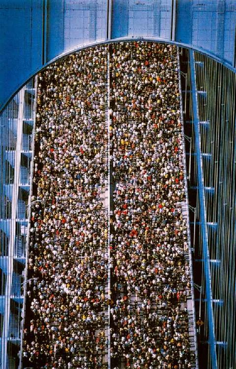 在资本主义再生产过程中,由于社会存在着大量的相对过剩人口,劳动力的追加总是非常容易的。在必要时,只要通过延长劳动时间或提高劳动强度,即使不增加劳动力的数量,也可以推动更多的劳动,从而实现扩大再生产。图中是1993年纽约5万人的马拉松大赛,委韦拉扎诺大桥上人头攒动,极度膨胀的过剩人口使劳动力的追加没有任何障碍可言。