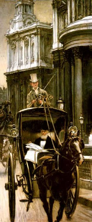 在资本主义生产条件下,工人创造剩余价值的那部分劳动是无酬劳动,无需资本家花费一文钱,这样商品生产的成本只能用资本的耗费来计算,而不能用劳动的实际耗费计算。劳动者只不过是构成生产资本的一个要素,而资本家永远是生产的主人。图中衣着华服的资本家正乘坐私人马车前往他的工厂。