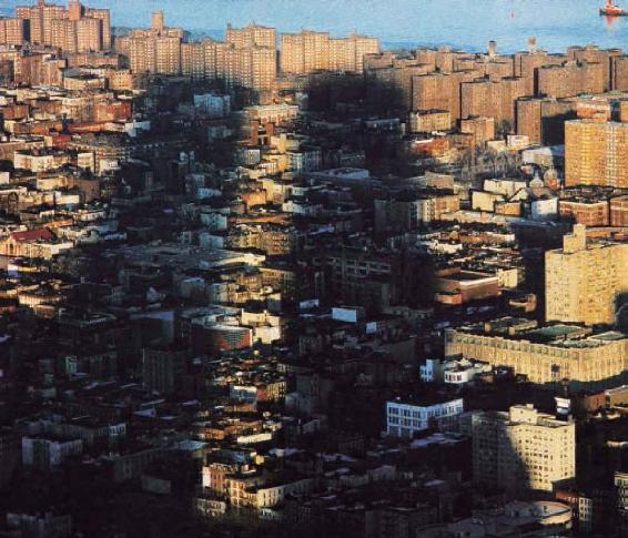 通过资本在不同部门之间根据利润率的升降进行的分配,不同的生产部门就会有相同的平均利润,因而价值也就转化为生产价格。资本主义体制在一个国家发展越是完善,这个国家就会越适应资本主义生产方式,这样资本就越能实现这种平均化。该图拍摄于1988年,纽约市甚至是全世界的金融中心的世贸中心双子大厦在曼哈顿的楼群上投下的巨大长影。