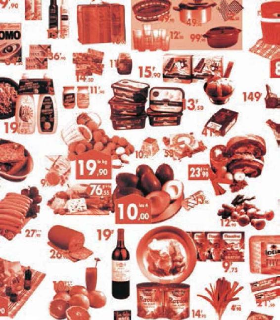 商品按照它们的价值来交换或出售是商品平衡的自然规律。一个部门的商品市场价值总量,是由社会为满足对它的需要而投入的社会必要劳动量决定的。这本身就是说以社会劳动按比例分配为前提的。供求不平衡引起价格波动,但价格的波动最后也会导致供求平衡。图中是超市定期更换的促销海报。