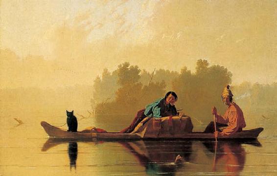 在资本主义发展过程中,随着生产的发展,市场范围的扩大,产业资本家为了集中精力从事生产活动并节约流通资本,便寻求由专门从事商品销售业务的商业资本家为其推销商品。于是,商品资本的职能就在产业资本循环过程中逐渐从产业资本中分离出来,成为独立地在流通领域中发生作用的资本了。图为19世纪中叶,晨曦中两个皮毛商人正驾着独木舟不辞劳苦地在密苏里河面上远途贩运,他们不仅具有商业资本家的雏形,而且充满创造性、最具冒险性的精神终将使其在众多社会角色中获得较特殊的地位。