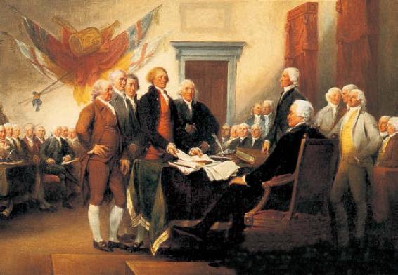 整个18世纪中期,英国和其北美殖民地之间的关系都非常紧张。1775年,在莱克星顿和康科德城爆发的美国革命战争导致了1776年《独立宣言》的诞生。6月10日由托马斯·杰弗逊负责草拟了独立宣言。其中宣称这些联合一致的殖民地从此是自由和独立的国家,它们取消一切对英国王室效忠的义务,它们和大不列颠国家之间的一切政治关系从此全部断绝;作为自由独立的国家,它们完全有权宣战、缔和、结盟、通商和采取独立国家有权采取的一切行动。7月4日《独立宣言》获得通过,并分送十三州的议会签署及批准。画中描绘的是起草《独立宣言》的委员会成员们在大陆会议上的场景。