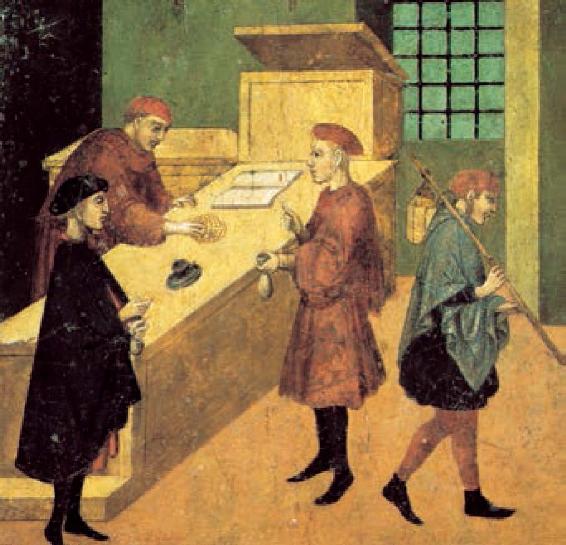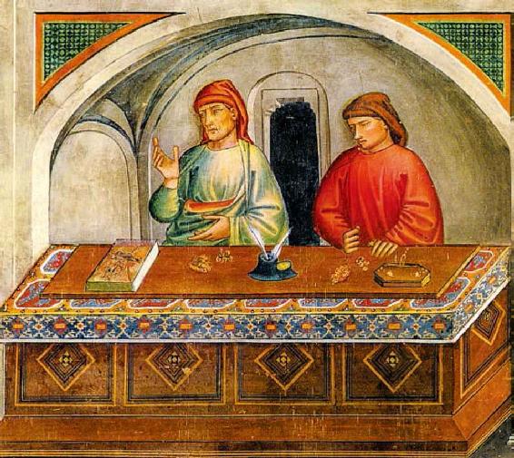 职能资本在循环过程中,经常会游离出大量的暂时闲置的货币资本,资本家就把这些资本以偿还和付息为条件借贷出去,供急需货币的企业使用,转化为生息资本。图中两名佛罗伦萨放债人正在柜台上进行交易,这种柜台在意大利语中称为工作台,“银行”一词便由此而来。