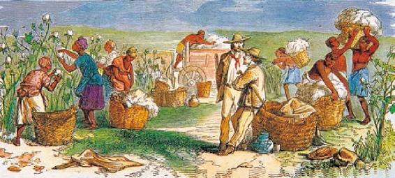新航线的开辟,使世界市场突然扩大,流通商品种类和数量增多,欧洲各国竭力想占有亚洲产品和美洲资源,在促进了封建生产方式向资本主义生产方式过渡的同时,也为欧洲殖民活动的兴起奠定了基础。图中描绘了19世纪被贩卖到美洲的黑人奴隶在种植园劳作的场景。