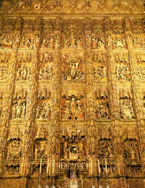 西班牙人征服南美之后,用从美洲获得的源源不断的金银来弥补它在国际贸易中出现巨额逆差,于是美洲的金银就通过西班牙流到了热那亚、尼德兰、英国、法国和南部德国。从殖民地掠夺的财富并没有使西班牙成为全欧洲最富裕的国家,却通过西班牙变成其他国家的原始资本,成为欧洲经济发展的重要推动力。图中是西班牙南部的塞维利亚大教堂祭坛中用黄金制成的群雕墙壁。