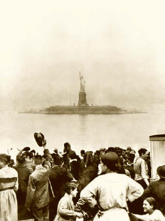 美国20世纪最初的10年,被称为历史上最大移民浪潮的顶点。从欧洲每年大约有70万至90万人通过埃利斯岛进入北美殖民地,移民主要有英国人,其次还有德、法、荷兰、瑞典等国人,正是这些大批的移民与当地最早居住的印第安人共同开发,经过一百多年的开拓,最终使美国成为世界上最重要、综合国力最强大的国家。图中的人们在象征着追寻美国梦的埃利斯岛上,为自由富饶的新大陆近在咫尺而振臂欢呼。