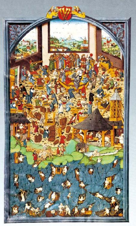 资本创造利润,土地创造地租,劳动创造工资。这种观点掩盖了资本主义各种收入的真正来源。资本属于一定历史社会形态的生产关系,并不能创造价值,土地作为自然界本身也不能创造价值,雇佣工人的劳动所创造的绝不仅仅是工资,其剩余劳动时间创造了利润(利息)和地租。图中是15世纪在波希米亚的第二大城市库特纳霍拉中,人们正在热火朝天地开采着银矿。