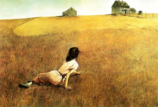 一位年轻的女子俯身在广袤的原野上,拂过草地寂静的风掠起她的碎发,人物的姿态与遥遥相对的屋舍营造出一种淡淡的感伤和不安。但明媚柔暖的色调却给人以温暖和希望,在冷漠孤寂之中仿佛深藏着某种神秘的力量。画中隐含着对现代工业文明深刻的忧思,在找寻失落的同时,又对人类社会不可预知的未来饱含着无限的憧憬。