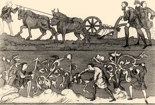 资本家生产剩余价值,必然想方设法地将生产商品所必需的劳动时间,缩减到当时的社会平均水平以下,这样成本价格缩短到它的最低限度的努力就可以成为提高劳动社会生产力的最有力的杠杆。图中中世纪的人们,农业生产几近于刀耕火种,他们还没有能力有效地提高生产水平,收成的好坏还是要看运气。