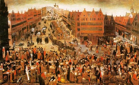 更具进取精神的荷兰人,因为航海技术技高一筹,使得他们在全球贸易网中,成为极其成功的中介人。图为荷兰安特卫普的一个熙熙攘攘的市场。16世纪初这个港口繁荣起来,这时它已经成为欧洲最重要的贸易中心,新的贸易通道已将西班牙和葡萄牙在美洲的殖民地与欧洲连接起来,安特卫普于是从中获益。