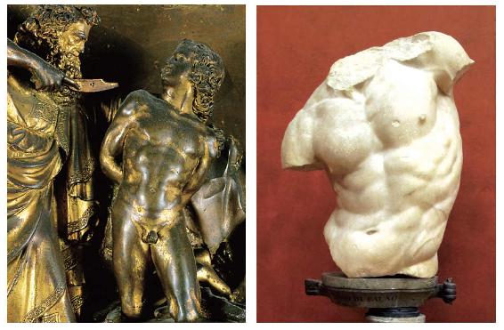 吉贝尔蒂塑造的以撒(左)借鉴了一尊古希腊雕塑(右)。这个雕塑以其收藏人高第命名,被称作“高第躯干”(Gaddi Torso),是古希腊人体塑像的代表作,现藏于佛罗伦萨的乌菲兹博物馆