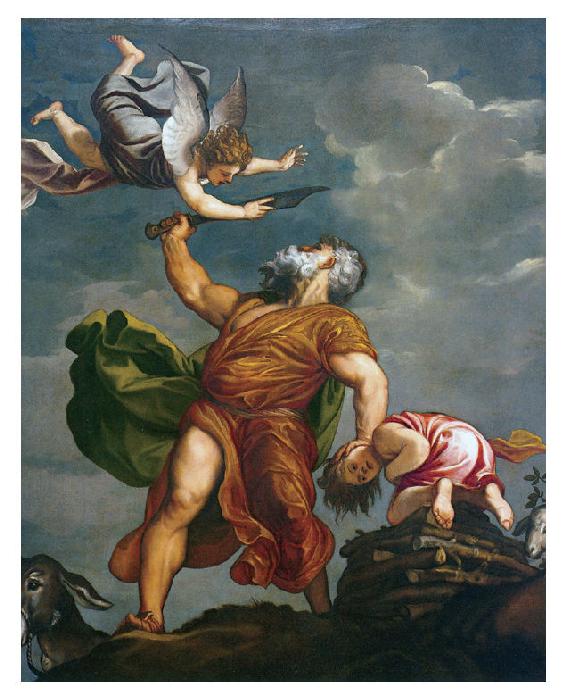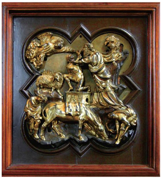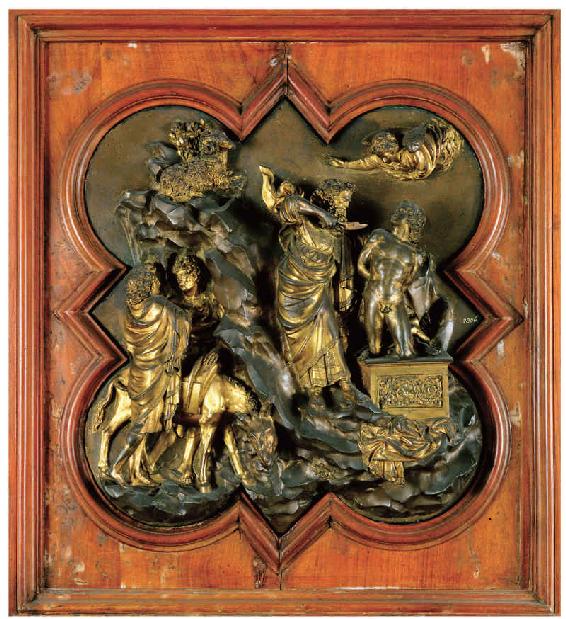 作为同时代最杰出的两位艺术大师,吉贝尔蒂和布鲁内莱斯基第一回合的较量是以《以撒献祭》的故事为题材,各自制作一幅青铜浮雕,用以装饰洗礼堂的青铜大门。《圣经·创世纪》中记载:上帝为了试探亚伯拉罕的忠心,让他用亲生儿子以撒做祭祀品,奉献给上帝。于是亚伯拉罕带着以撒上了山,让两个仆人和驴子在山下等候。就在他举刀砍向祭台上的以撒的瞬间,天使阻止了他。原来这是上帝导演的一出戏,目的是试探亚伯拉罕是否虔诚,真正的祭品其实是天使带来的一只羔羊。《以撒献祭》的故事正好迎合了佛罗伦萨人当时的心境,即希望在“瘟疫”和“战争”的灾难即将灭顶之时,上帝能够出手相救。