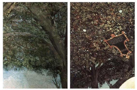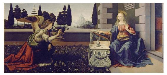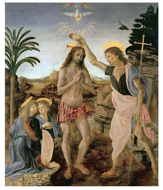 画左边的小天使出于达·芬奇之手,其他部分由其老师韦罗基奥完成