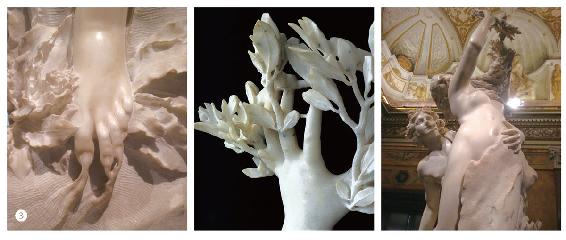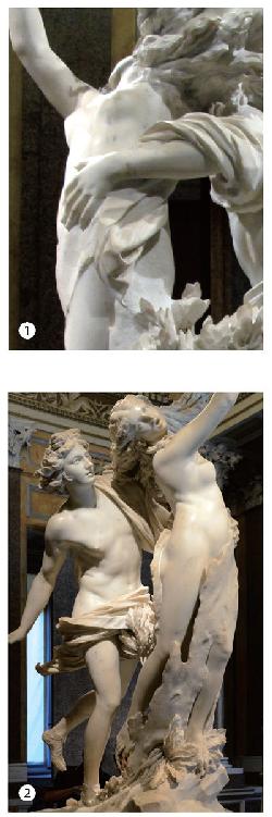 贝尔尼尼在构思这尊雕塑时,没有沿袭前人古典主义的规则——平稳的均衡、永恒的静止,而是使用了巴洛克的新手法——强调动感,突出戏剧化的“一刹那”。阿波罗追逐的姿态、飘舞的衣带、飞扬的头发,与达芙妮挥舞于空中的双手、扭曲幻化成桂树的身体组成了一个立体的S形,螺旋向上,与古典雕塑的四平八稳截然不同。特别值得称道的是,贝尔尼尼准确抓取了故事的三个高潮瞬间:其一是阿波罗追赶上了达芙妮的瞬间,他的左手已经接触到了少女的身体①;其二是达芙妮用尽最后的力气腾身跃起的瞬间,她已高于阿波罗并悬于空中②;其三,也是最富于戏剧化的瞬间:达芙妮幻化成桂树,树叶从她的手指、发间生出,树皮蹿出地面覆盖了她的下身,她的脚趾也长出树根……③