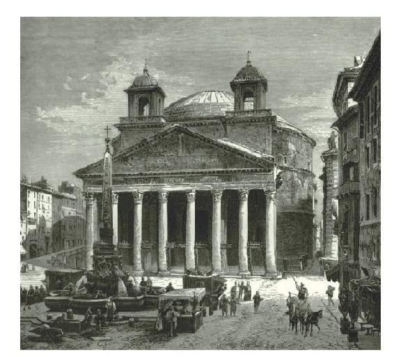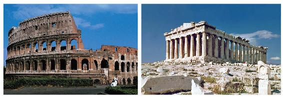 古典建筑的代表作:古罗马的斗兽场(左)和雅典卫城的巴特农神庙(右)