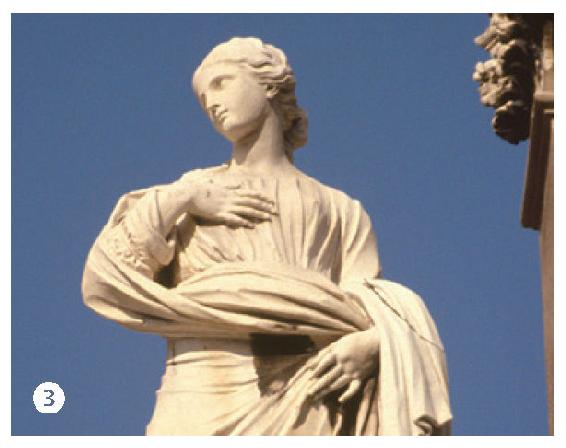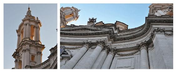 这一回合的斗法使两个冤家的矛盾公开化了。罗马一直流传着有关纳沃纳广场喷泉和教堂的说法:贝尔尼尼设计的代表美洲的普拉塔河神身躯后仰,左手举起,似乎是对面波洛米尼的圣阿格尼斯教堂倒塌时的本能反应①;代表非洲的尼罗河神则以巾掩面,好像不忍再看对面“丑陋”的教堂②。而波洛米尼的回应是在圣阿格尼斯教堂屋顶立起一座圣女的塑像,她信誓旦旦地以手抚胸,好像在说:姐这特好!保准屹立千年不倒,不像你的“驴耳朵”③。
